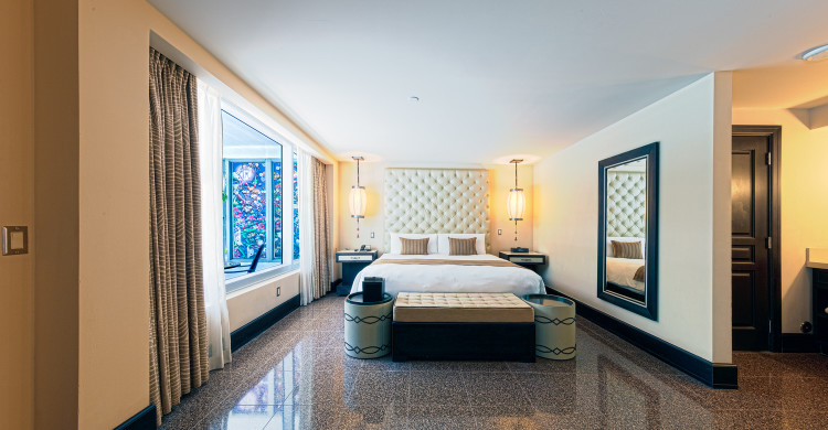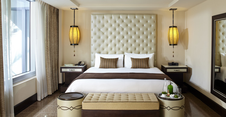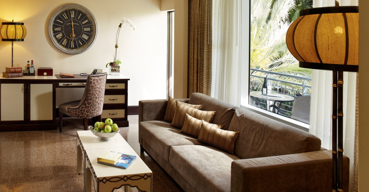 Overlooking our One-of-a-Kind Infinity pool from your private terrace in our newly-renovated Cabana Suite. Approximately 670 sq. ft. in size, the sleeping area has a king-sized bed and seperate living area. Special features of the Cabana Suites include a Bose stereo system. Additional amenities include a 42" Flat Screen TV with pay-per-view movies. Our very own National Hotel bath amenities make for a very luxurious bath experience. Enjoy a restful night’s sleep on our pillow-top mattress and European cotton linens with a down comforter and feather pillows. Other amenities include an alarm clock with CD player, terry robes, full size iron and board and hairdryer. Stay connected to friends and family with our High-Speed Wireless access. Same day valet laundry service and a fully-stocked mini bar are available along with our 24-hour Award Winning Concierge Services. This non-smoking room also comes equipped with a work desk and sitting area.