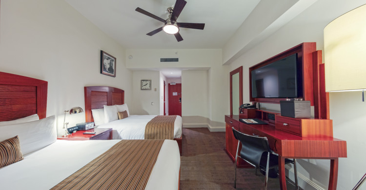 Take in an Art Deco view in a tastefully appointed guestroom featuring a TV w/DVD player and pay-per-view movies. Our very own National Hotel bath amenities make for a very luxurious bath experience. Enjoy a restful night’s sleep on our pillow-top mattress and European cotton linens with a down comforter and feather pillows. Other amenities include an alarm clock with CD player, terry robes & slippers, full size iron and board and hairdryer. Stay connected to friends and family with our High-Speed Wireless access. Same day valet laundry service and a fully-stocked mini bar are available along with our 24-hour Award Winning Concierge Services. This non-smoking room also comes equipped with a work desk, comfortable lounge chair and side table.