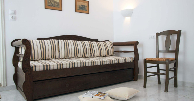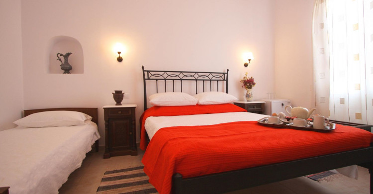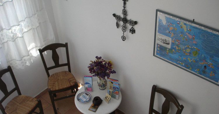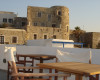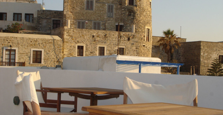 The rooms are equipped with satellite TV, direct telephone line, free Wifi, ceiling fan, air conditioning, refrigerator, hairdryer, safe, bathroom/shower, and daily cleaning service. Most rooms offer a unique view of the sea, the Castle, and the Chora. There is a reception area and a breakfast room decorated in traditional island style with café tables. On the hotel's terrace, guests can enjoy the sunset and the splendid view of the Aegean Sea and the Chora, along with their afternoon coffee or dessert in a unique setting.