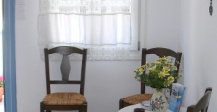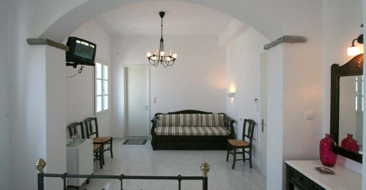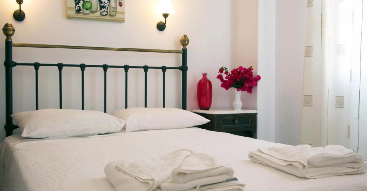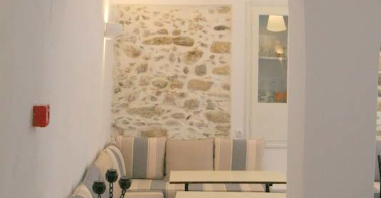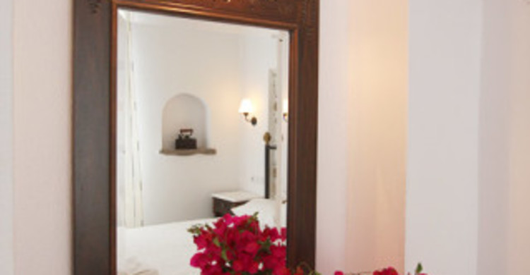 The hotel is built in accordance to the traditional architectural style of the Cycladic islands. The hotel features 13 rooms and small suites. Beautiful fuchsia-colored plants set in contrast against the bright white hotel walls greet visitors at the entrance.