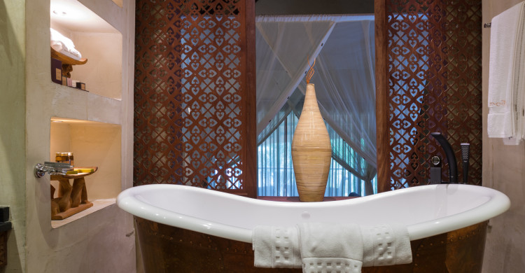 Fancy walking on steps that leads you to a bathtub that has wooden shutters you can draw and have a conversation with your partner on the bed or watching TV with a glass of wine. All from the comfort of your bathtub. Wake up to birds chirping while you are having breakfast on your balcony overlooking the Volta River. That is an apt description of our room configuration and the look and feel it gives you.