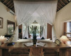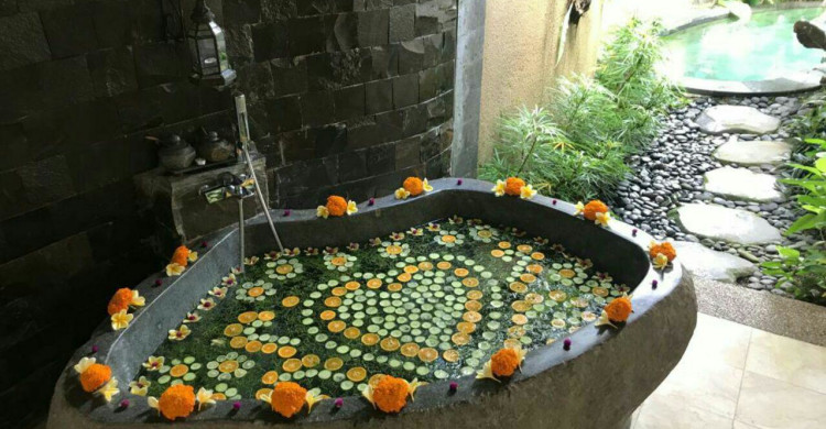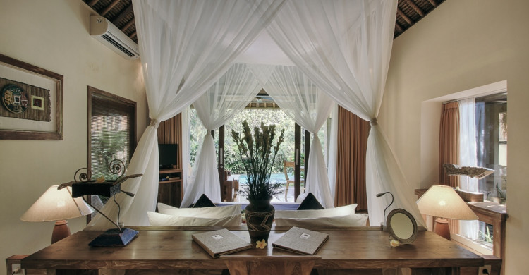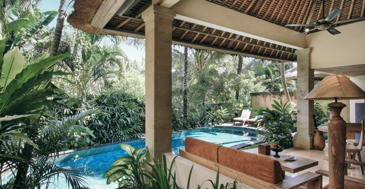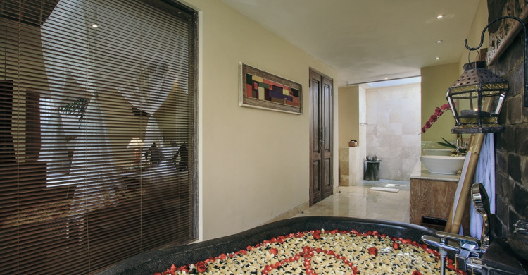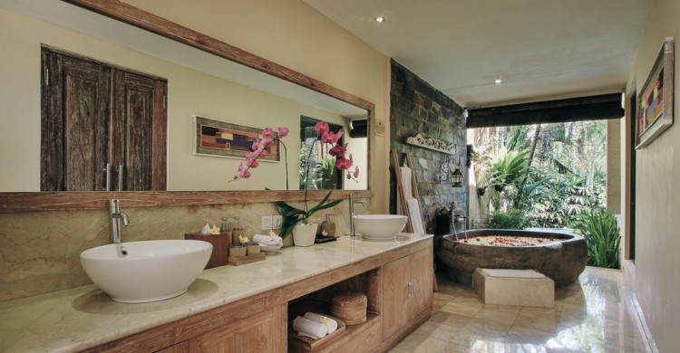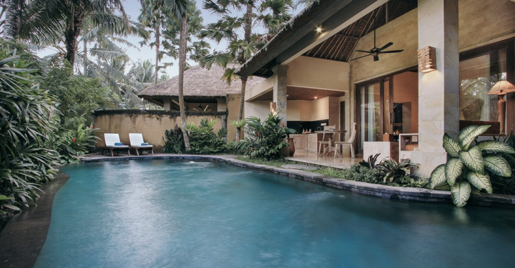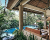 Size 150m2 A luxurious villa elegantly designed to tailor your need of space and privacy. The villa features private garden, an artistic private infinity pool with wooden sun deck, dining pavilion with kitchenette, white-washed wooden furniture, wooden floor, high quality king size bed with mosquito net, sofa bed, 29’ LED TV, DVD player, elegant high quality cotton linen, and spacious bathroom with marbled semi open bathtub, natural stone shower, fully equipped with luxurious sanitary and amenities
