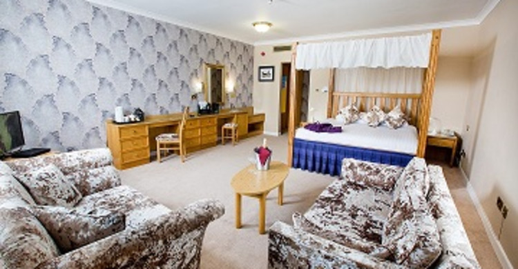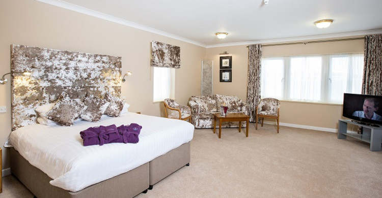 Finished in Yorkshire stone with a decorative blue mosaic tile, our executive bathroom includes corner bath and wet room. The large adjoining bedroom has been redecorated in a more traditional style with King size bed, 32 inch flatscreen TV and DVD player.