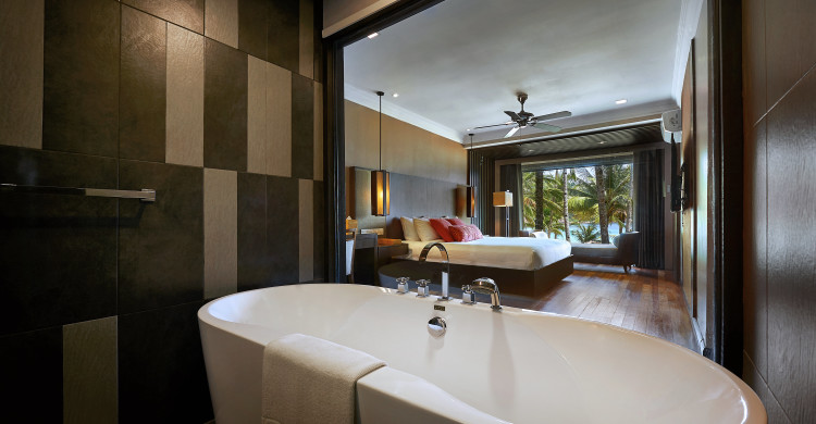Situated on the beach, and so close to the ocean, you can almost hear the waves break from the upper or lower level Asian-styled suite. The Ocean Front Suite offers a separate living room and private veranda on which to enjoy the breeze while admiring the turquoise blue ocean.