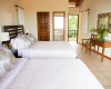 This room includes two queen sized beds with luxurious linens, a private bath and endless ocean view window. Located on the upper level of the main house, this room is the perfect complement for the connecting suite next door which shares a large balcony with outdoor seating, an inside-lounge with mini bar with the Master Suite.