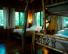 There are two double beds with a single bunk bed above one of the double beds. The window seat also pulls out to make another twin bed. We can also add a floor mattress for a child. This tree house has a large wrap around deck with plenty of room to sit and enjoy your vacation.