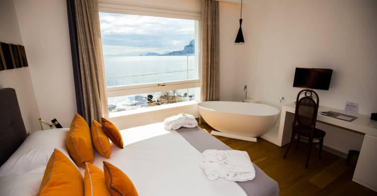 Romantic, designed for the couple to discover the sea of Sicily, characterized by a bathtub in the room with sea view. Spacious over 20 square meters, each Deluxe room has a soul that connotes it in a unique way: to discover, to live for an unforgettable holiday. Art is one of the main themes: each room becomes a personal exhibition conceived for its guests. Buzzotta, Schifano, Morales and other contemporary artists succeed each other in a tale steeped in Sicily and art. The soft tones of the design furniture become the canvas on which to depict the memories of your stay Unìco. The Deluxe is designed for the quality of sleep, thanks to the choice of king-size or queen-size and pillow menu. Parquet and the choice of design accessories will also guarantee the quality of the living room. The addition of the third bed is only possible for children under 18 years. Room facilities: - Air conditioning - Wi-Fi - Free-standing bathtub in room - Safe - Smart TV 40"Dvbt - Minibar with assortment of water and soft drinks - Walk-in shower - 500gr bathrobe and bathroom line - Complimentary toiletries Maison Margiela - Pets of any size or race are not allowed.
