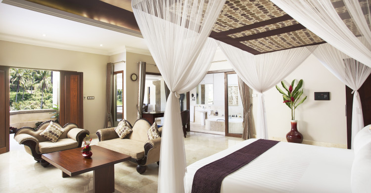 These suites provide an intimate feeling, with their spectacularly spacious interior, heated plunge pool and semi-outdoor bathroom beautifully blending indoor and outdoor living spaces. Luxury hotels in Bali rarely see a starting room as elegant as ours. This private pool villa in Bali with a stunning jungle view will not disappoint you!