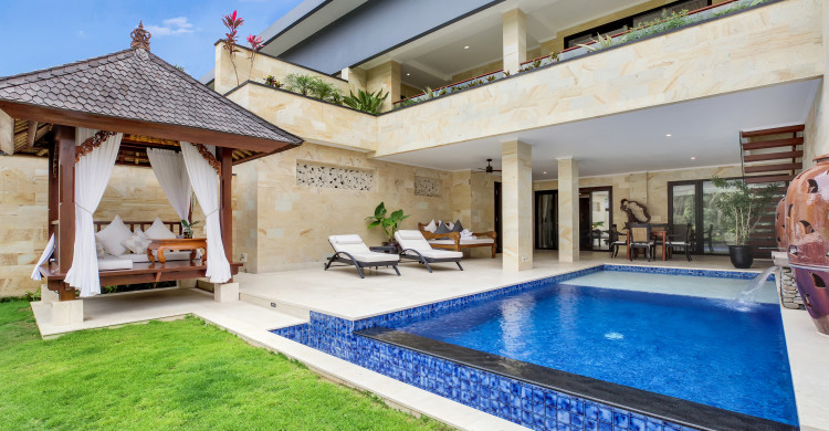This 2 bedroom Private Pool Villa is fit for royalty, boasting an expansive master bedroom plus living area that steps out to a deck with stunning Bali jungle views. There is the option for this to be converted into a 2 bedroom family villa with a second bedroom and balcony upstairs. The large outdoor heated pool is partially shaded and overlooks the lush vistas, providing the perfect spot to perch all day and in all weather.