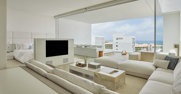This dramatic 1,615-square-foot suite immerses you in your own private Los Cabos dreamscape. Transformative views of the horizon on the Sea of Cortez can be taken in from your 380-square-foot terrace, or your minimalist yet luxurious open-air living space. Among the highlights: a furnished balcony and sumptuous ROIL bath products.