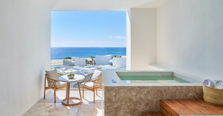 Partial ocean views are the star of this 1,300-square-foot suite. Experience the sensation of well-being and harmony with the water and sky in your private indoor/outdoor living space. Among the highlights: a furnished balcony, inspired views of the futuristic architecture, and sumptuous ROIL bath products.