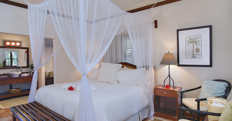Our eight Plantation Rooms face the beach, and feature private entrances and verandas for you to enjoy the view of tropical bougainvillea, colorful hibiscus gardens and magnificent palms. At 375 square feet, there is plenty of space to spread out and relax. Each unit comes with finely crafted mahogany furniture and includes a king-size bed draped in decorative netting. All units are fully air conditioned.