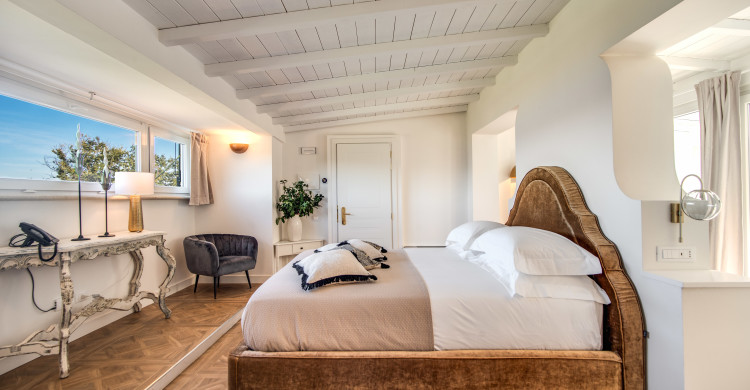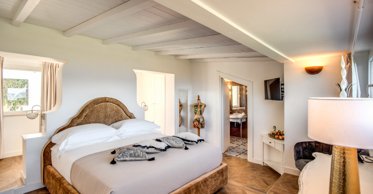 A romantic sanctuary of 40 sqm, this exclusive suite is a celebration of Italian elegance and timeless charm. The king-size bed invites restful nights wrapped in soft, natural linens, while the refined ensuite bathroom offers a moment of quiet indulgence beneath a soothing shower. Thoughtfully designed with comfort in mind, the suite includes a spacious wardrobe, writing desk, safe, minibar, and a tea & coffee maker for intimate mornings together.