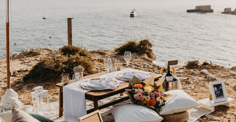 Imagine arriving at a secret beach or a golden cliff at sunset, the sea whispering softly, candles glowing, and a table prepared just for two ✨