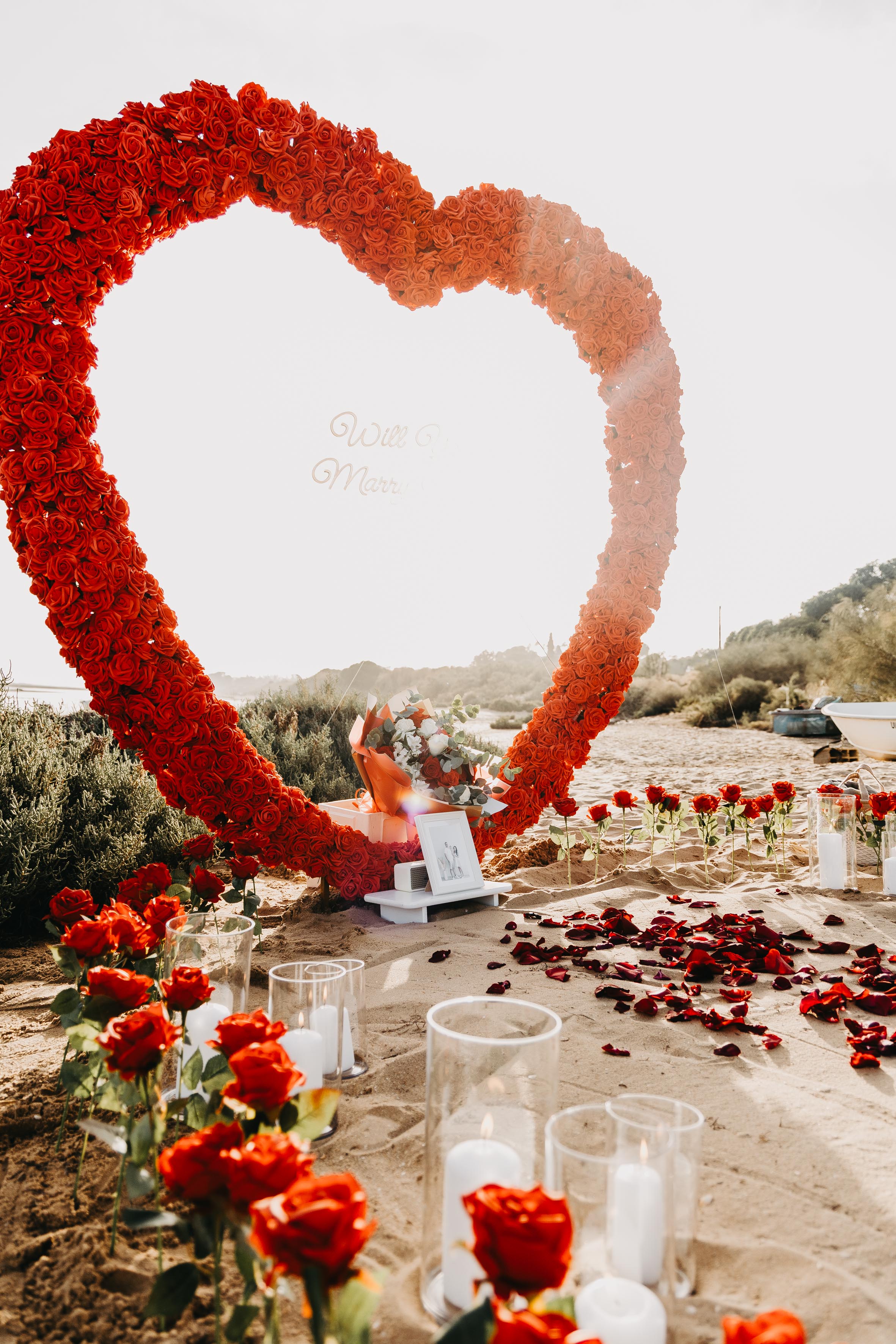 🌹 Exclusive Setup Our most grand and cinematic arrangement, featuring a heart of roses, glowing “Marry Me” sign, and a full romantic setup worthy of a movie moment.