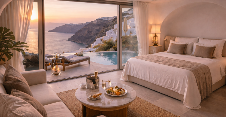 In Santorini’s most sought-after locations — Oia and Imerovigli — they recommend exceptional hotels such as: